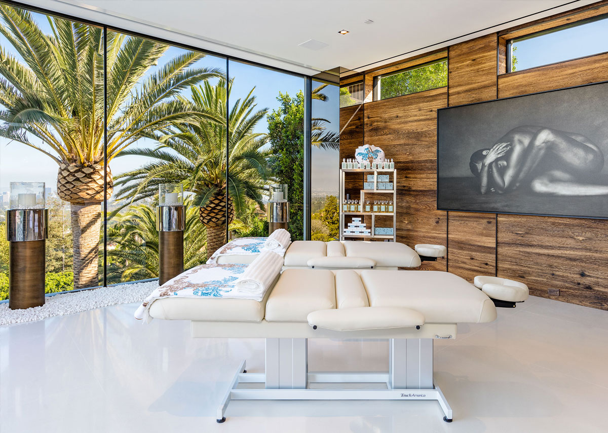 This triumphant marvel includes two master suites, 10 oversized VIP guest suites, 21 luxury bathrooms, three gourmet kitchens, five bars, a massage studio/wellness spa, state-of-the-art fitness center, and an 85-foot glass tile infinity swimming pool.